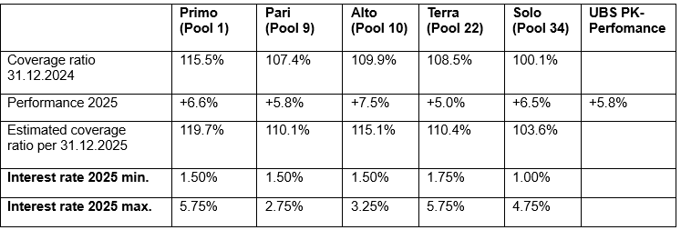 Despite challenges, 2025 was another good investment year. The following table shows the performance of the open pools and the estimated coverage ratio at the end of December 2025.