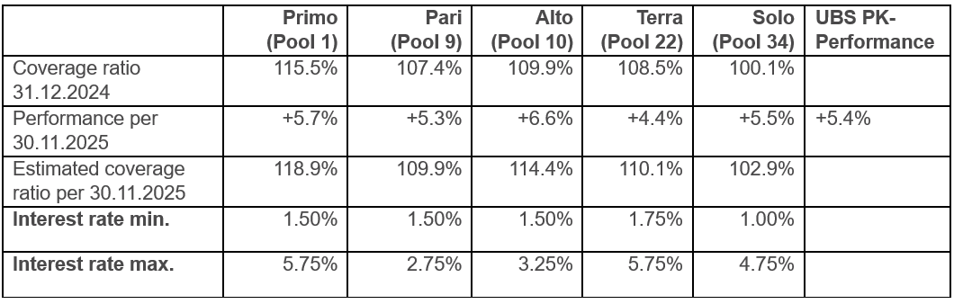 Despite challenges, 2025 was another good year investment year. The following table shows the performance of the open pools and the estimated coverage ratio at the end of November 2025.