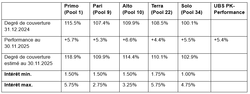 Malgré les enjeux de l’année écoulée, 2024 a été une bonne année de placement. Le tableau ci-dessous montre la performance des cinq pools ouverts ainsi que le degré de couverture calculé provisoirement au 31.12.2024.