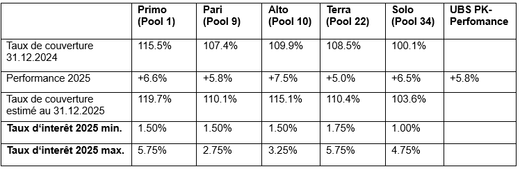 Malgré les enjeux de l'année écoulée, 2025 a été une autre bonne année de placement. Le tableau ci-dessous présente la performance des cinq pools ouverts ainsi que le taux de couverture estimé à la fin décembre 2025.