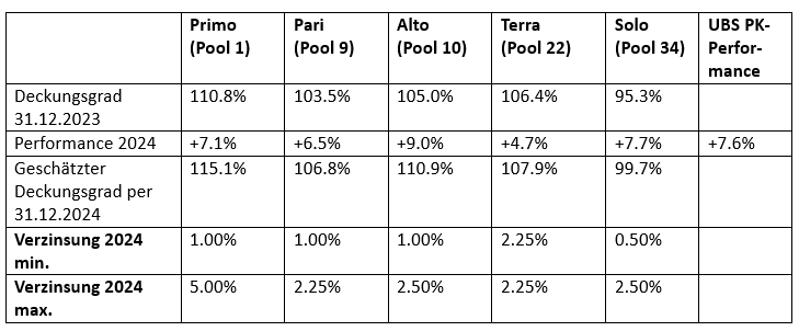 Trotz den Herausforderungen war 2024 ein gutes Anlagejahr. Die nachfolgende Tabelle zeigt die Performance der fünf offenen Pools sowie den provisorisch berechneten Deckungsgrad per 31.12.2024.